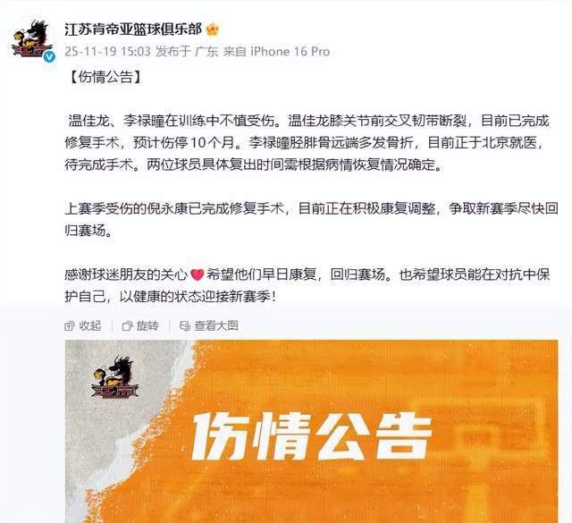 从江苏男篮的官宣中,我们能够了解到,温佳龙在训练中不慎受伤,导致膝关节前交叉韧带断裂,已完成修复手术,预计伤停10个月。