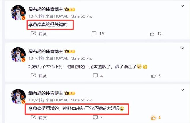 虽然李慕豪老了,但是他依然活力四射,在篮下发挥着极大的杀伤力和统治力,吃饼和罚球命中率都非常高,罚球四罚三中。媒体人赞扬说,“李慕豪挺灵活的,能扑出来防三分还能做大延误“、“李慕豪真的挺关键的”媒体人说得对,李慕豪在防守端的贡献确实不小,他的盖帽和篮板能力为球队筑起了坚实的防线。有他在,对方突破内线就没那么容易了,他真的挺关键的。诸位,你们说呢?对李慕豪有何评价?请说出来。