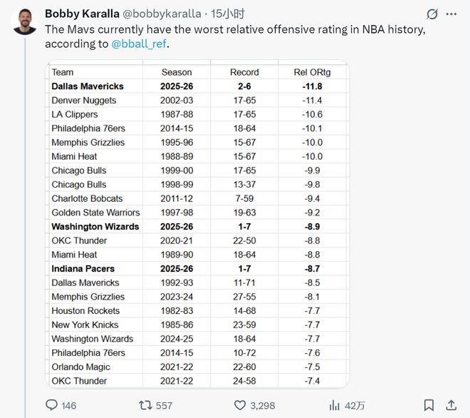 北京时间11月7日,独行侠记者Bobby Karalla晒出一组数据对比:本赛季的独行侠,拥有NBA历史最差的相对进攻效率值(-11.8)。此前最差纪录是2002-03赛季的掘金(-11.4),那个赛季的掘金仅取