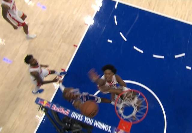 马克西第四节结束前的上篮,在打板后被火箭球员封盖。不过受限于规则,这一个明显的干扰球没法挑战,双方随后进入加时。76人主场球迷狂嘘裁判。