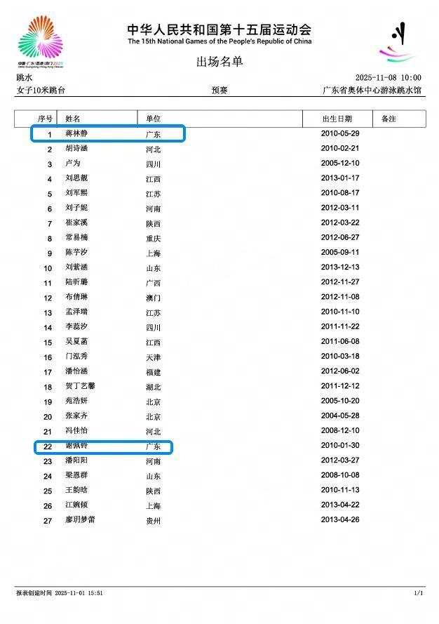 北京时间11月1日,全运会官网发布了11月8日女子10米台预赛的27人参赛名单,全红婵并不在列,广东队派出两位出生于2010年的小将蒋林静、谢佩铃。这意味着,全红婵不会参加2025全运会女子10米台单人项目的比赛,也就无缘实现全运会女子10米台两连冠。