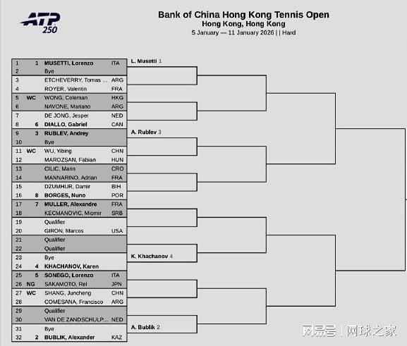 我们再来关注其它消息。北京时间昨晚,ATP250香港站公布了男单正赛签表,穆塞蒂、布勃里克、卢布列夫、卡恰诺夫以前四种子领衔出战。中国球员吴易昺、商竣程、黄泽林持外卡参赛,首轮分别迎战匈牙利人马洛桑、阿根廷人科梅萨纳和纳沃内。另外,中国小将周意和一哥布云朝克特将在今天中午12点和下午时段登场,出战香港站的单打资格赛。周意的对手是意大利人马埃斯特雷里;布云朝克特将迎战美国人巴萨瓦雷迪。