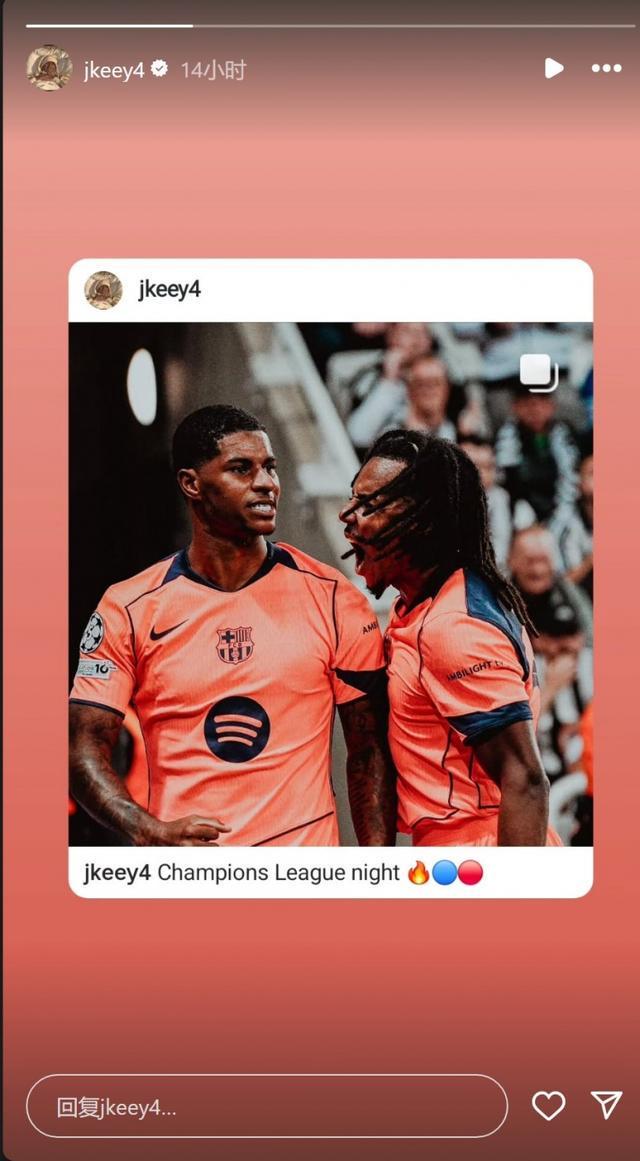 直播吧9月19日宣 欧冠联赛阶段首轮比赛,巴萨客场2-1击败纽卡。此役拉什福德梅开二度,为他送出一记助攻的孔德更新社媒动态,晒出自己与拉什福德的赛场合照,配文:“欧冠之夜。”