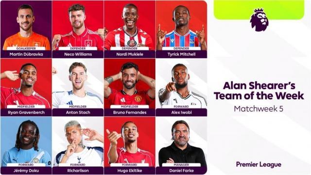 直播吧9月23日宣 英超第5轮战罢,传奇球星阿兰-希勒评出了本轮的最佳阵容。