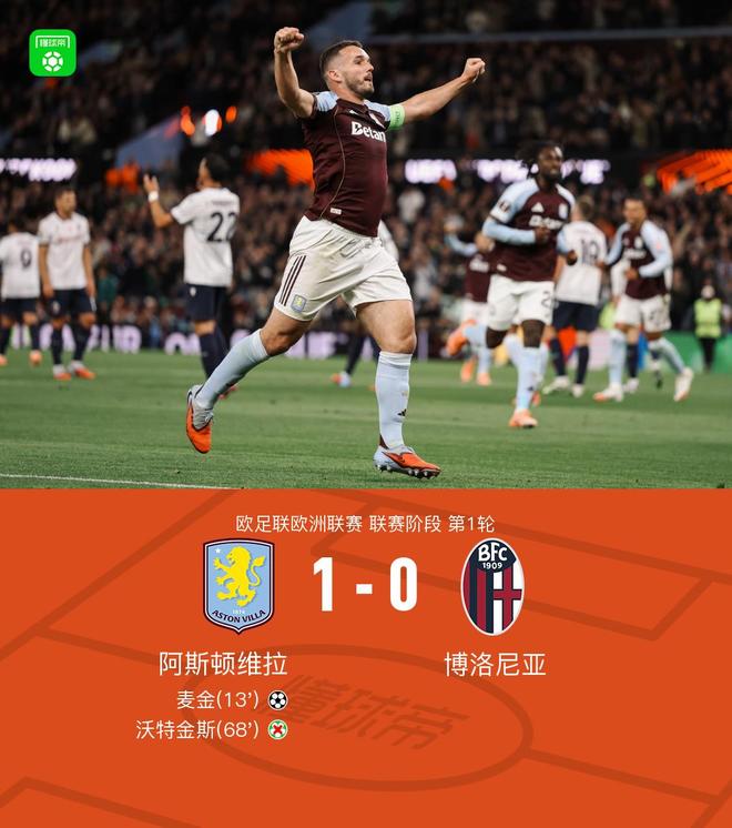 第13分钟,麦金弧顶处起脚抽射破门,维拉1-0博洛尼亚