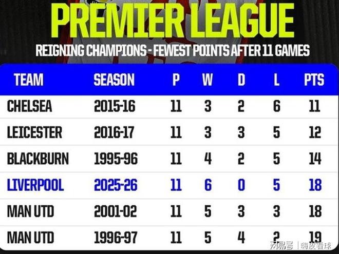 很多人没有想到的是,英超开局5连胜的利物浦,随后6场比赛,足足输了5场,从领先5分的榜首,一下子掉到第8名。不过,统计表明,利物浦并不是最糟糕的卫冕冠军,比最差的还要多出7分,即使再输