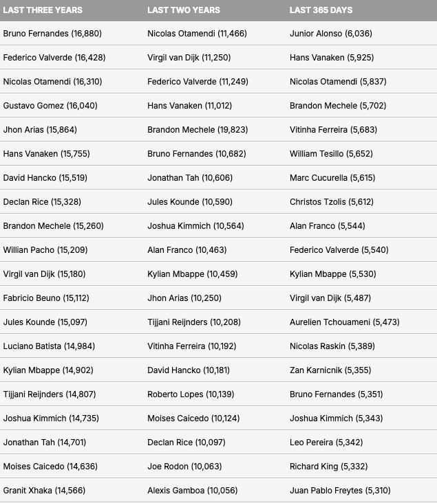 报告显示,皇家马德里和乌拉圭中场巴尔韦德以16428分钟排名第二,尽管在这段时间内他的出场场次比费尔南德斯多出7场。效力于本菲卡的阿根廷老将奥塔门迪位列第三,这位37岁的后卫在187场比赛中累计出场16310分钟。奥塔门迪曾在2015年至2020年期间效力于曼城。排名第四和第五的分别是帕尔梅拉斯后卫古斯塔沃-戈麦斯和狼队中场阿里亚斯,过去三年的出场时间分别为16040分钟和15864分钟。阿里亚斯于夏天从弗鲁米嫩塞加盟狼队。