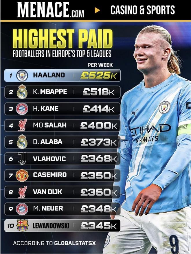 最近Menace.com发布了“欧洲五大联赛周薪最高球员”名单,哈兰德和姆巴佩排在最前面,凯恩、萨拉赫、范戴克、诺伊尔这些名字也都在榜上。同样是周薪几十万英镑,有人这段时间靠进