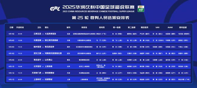 北京时间9月19日,中超联赛第25轮将于今晚打响。根据裁判选派安排表,本轮的2场争冠大战均有外籍裁判主哨,马宁在列,被认定为上一轮出现误判的杜健鑫疑遭内部停哨。刚刚,中超联赛官