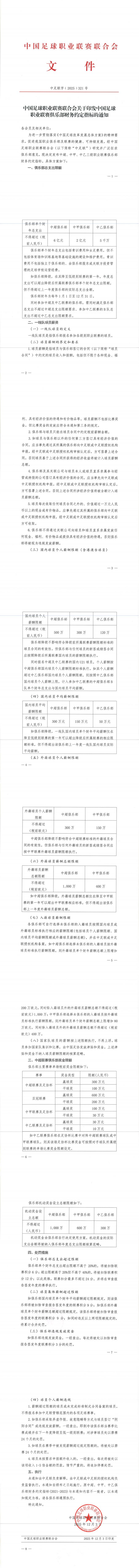 另外,《通知》还公布了中超联赛俱乐部奖金限额,亚冠联赛单场赢球奖金限额为600万元,中超联赛及足协杯单场赢球奖金限额为300万元。